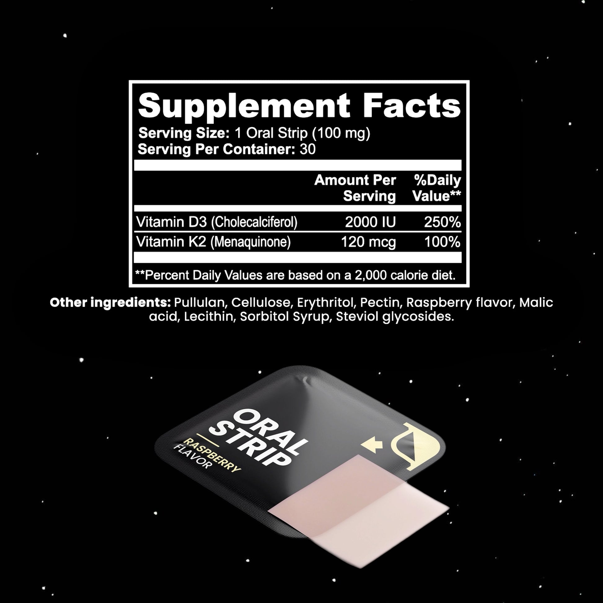 Ingredients: Vitamin D3 (Cholecalciferol) (2000 IU), Vitamin K2 (Menaquinone) (120 mcg), Pullulan, Cellulose, Lecithin, Raspberry Flavor, Malic Acid, Erythritol, Sorbitol Syrup, Pectin, Steviol Glycosides