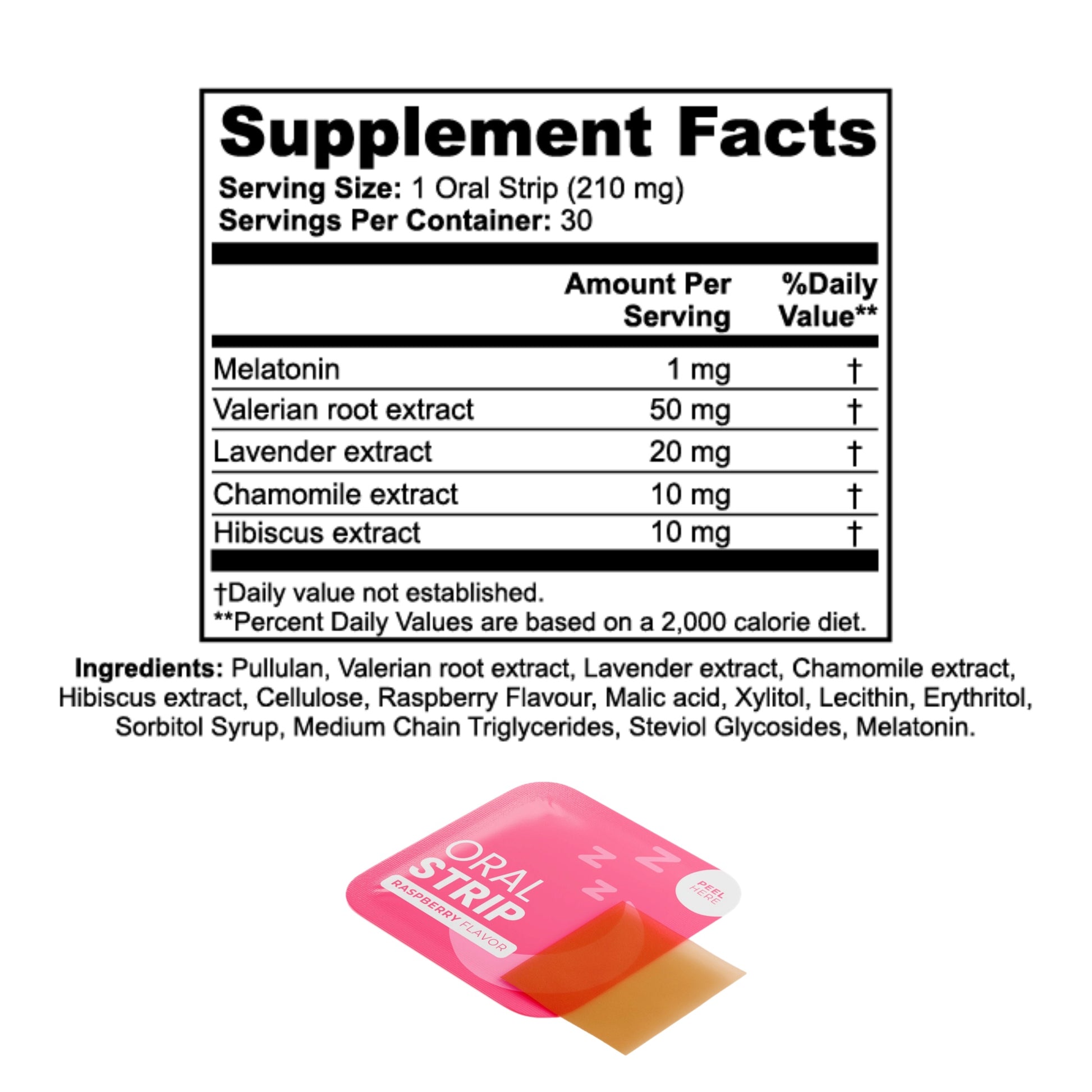 Ingredients: Pullulan, Valerian root extract, Lavender extract, Chamomile extract, Hibiscus extract, Cellulose, Raspberry Flavor, Malic acid, Xylitol, Lecithin, Erythritol, Sorbitol Syrup, Medium Chain Triglycerides, Steviol Glycosides, Melatonin